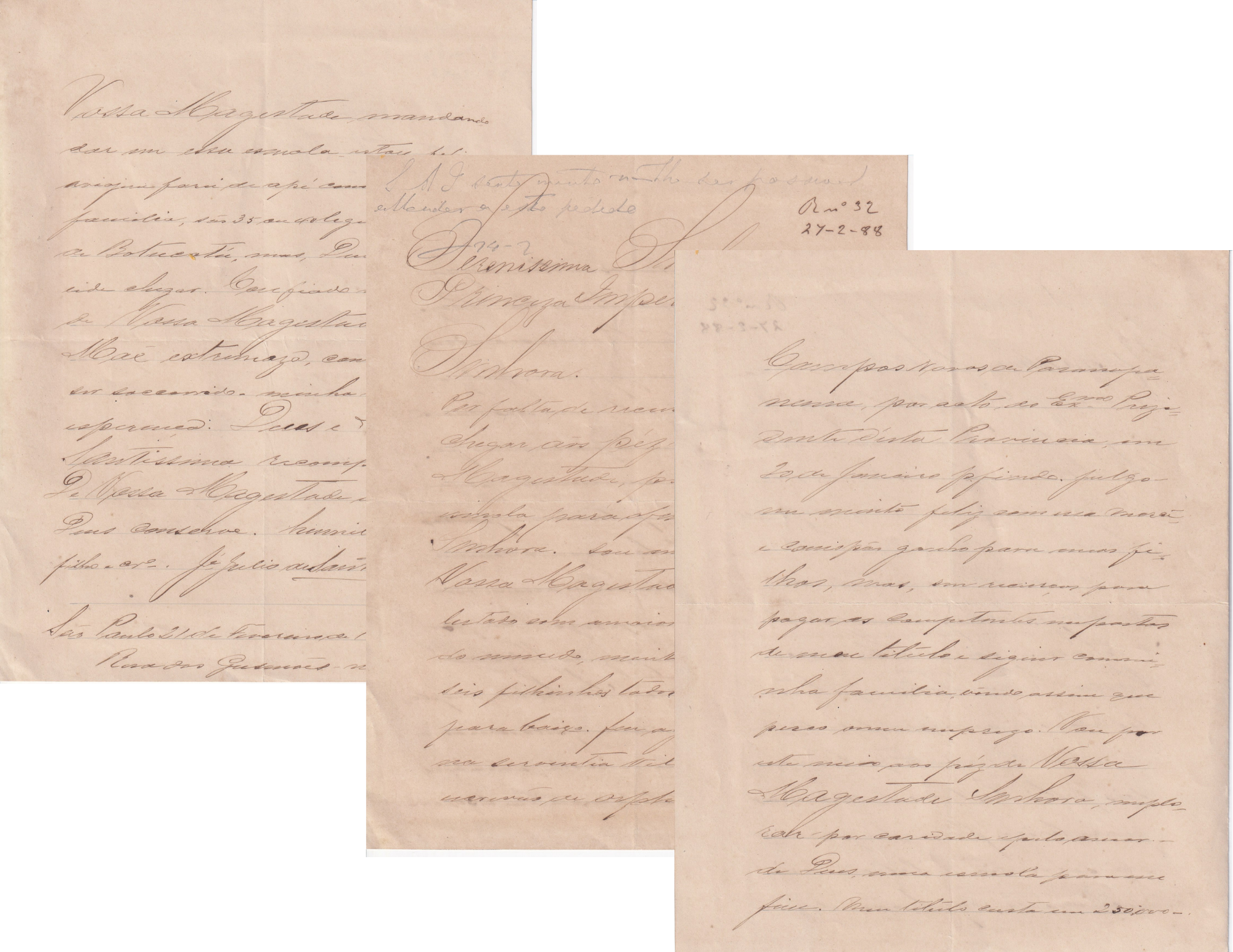 Estas três cartas, recebidas em 1888 por Princesa Isabel, mostram o impacto humano imediato da assinatura da Lei Áurea. A primeira é um agradecimento emocionado pela abolição da escravidão: o autor celebra o fim de mais de três séculos de cativeiro e chama o gesto de um feito “gravado na história com letras de ouro”. A segunda carta muda o tom e revela a dura realidade social do período: um súdito pobre descreve dívidas, fome e o desespero de sustentar a família, pedindo ajuda direta à princesa, vista como última esperança. Já a terceira vem de um veterano da Guerra do Paraguai, que pede reconhecimento oficial por seus serviços, solicitando a Ordem de Cristo. Juntas, essas cartas contam uma história poderosa: a alegria da liberdade recém-conquistada, a miséria que continuava a atingir muitos brasileiros e a busca por justiça e reconhecimento. Elas mostram como a Princesa Isabel se tornou, naquele ano decisivo, um símbolo de esperança — e também o peso enorme que suas decisões tiveram sobre a vida real das pessoas.