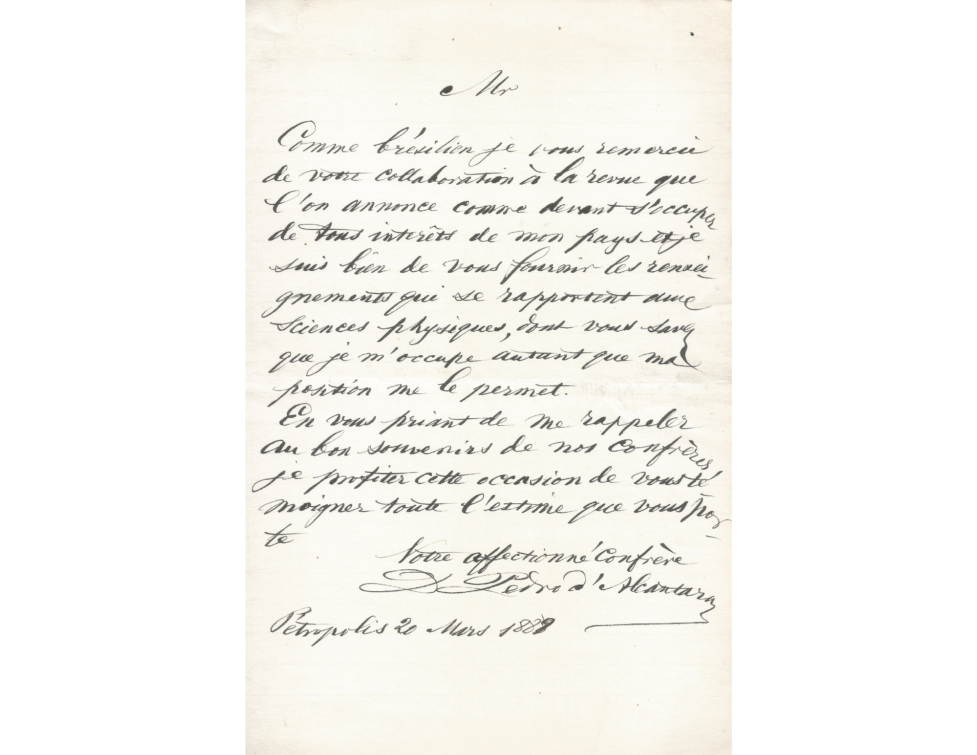 Este conjunto de sete cartas revela um lado fascinante de Dom Pedro II: o de um governante que usava a escrita para construir pontes entre o Brasil e a ciência europeia. Redigidas em francês, entre Petrópolis, Rio de Janeiro, Paris e Cannes, as cartas são endereçadas a grandes intelectuais da época, como Jules Taschereau e o químico Marcellin Berthelot. Nelas, o imperador recomenda jovens cientistas brasileiros, pede notícias sobre pesquisas, comenta teorias científicas e reafirma, várias vezes, seu amor pela ciência e pelo progresso. Não é conversa de protocolo: Dom Pedro II escreve como um colega, curioso e entusiasmado, mesmo sabendo que seu cargo o impedia de ser cientista “de verdade”. Essas cartas mostram como ele tentava, nos últimos anos de seu reinado, fazer o Brasil aprender com a França e entrar no mundo moderno pelo caminho do conhecimento. É um retrato raro de um imperador que acreditava que livros, laboratórios e professores podiam mudar o destino de um país.